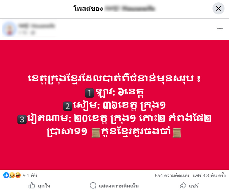 ภาพบันทึกหน้าจอแสดงโพสต์อ้าง “ลาว ไทย เวียดนาม” ยึด 62 จังหวัดของกัมพูชา