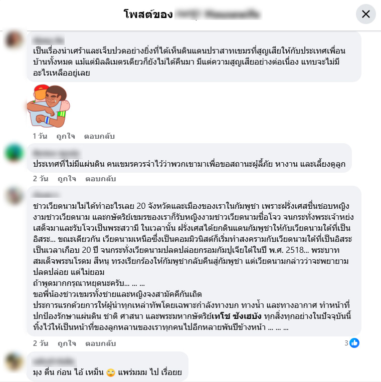 ขณะที่กรณีของลาวนั้น ลาวในหลาย ๆ พื้นที่ก็เคยอยู่ในเขตอำนาจที่เคยมีวัฒนธรรมเขมร โดยสามารถพบร่องรอยได้ขึ้นไปถึงจำปาสัก จึงคิดว่าโพสต์ดังกล่าวน่าจะตีความผ่านประวัติศาสตร์ในอดีต ว่าดินแดนเขาเคยขยายใหญ่ขนาดไหน แล้วปัจจุบันมันหายไป ซึ่งทำให้มีคำว่าจังหวัด แต่ในอดีตไม่มีคำว่าจังหวัด และในอดีตก็ไม่มีคำว่าพื้นที่ของใครอย่างชัดเจน แต่พื้นที่ต่าง ๆ จะถูกยึดครองตามรัชสมัยของกษัตริย์พระองค์ใดพระองค์นึงตามความเข้มแข็งของตัวกษัตริย์