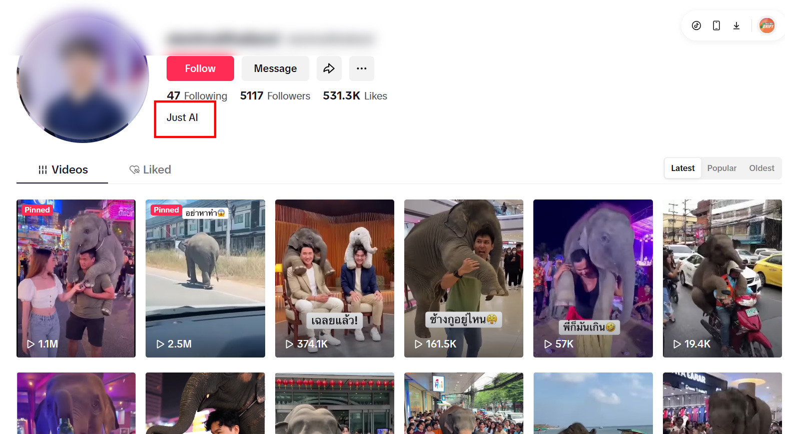 ผู้ใช้บัญชีรายหนึ่งใน TikTok ที่ผลิตเนื้อหาเกี่ยวกับคนแบกช้าง ระบุในช่องแนะนำตัวว่า “Just AI”
