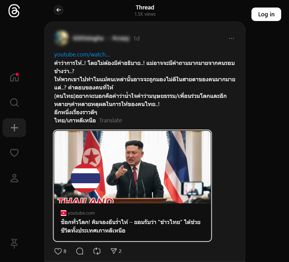 ผู้ใช้บัญชีเธรดรายหนึ่งโพสต์คลิปที่มีภาพของผู้นำเกาหลีเหนือ คิม จองอึน พร้อมข้อความระบุ “คำว่าการให้..! โดยไม่ต้องมีคำอธิบาย..! แม้อาจจะมีคำถามมากมายจากคนรอบข้างว่า..? ให้พวกเขาไปทำไมแม้คนเหล่านั้นอาจจะถูกมองไม่ดีในสายตาของคนมากมายแต่..? คำตอบของคนที่ให้ (คนไทย) อยากจะบอกคือคำว่าน้ำใจคำว่ามนุษยธรรม/เพื่อนร่วมโลกและอีกหลาย ๆ คำหลายเหตุผลในการให้ของคนไทย..! อีกหนึ่งเรื่องราวดี ๆ ไทย/เกาหลีเหนือ“