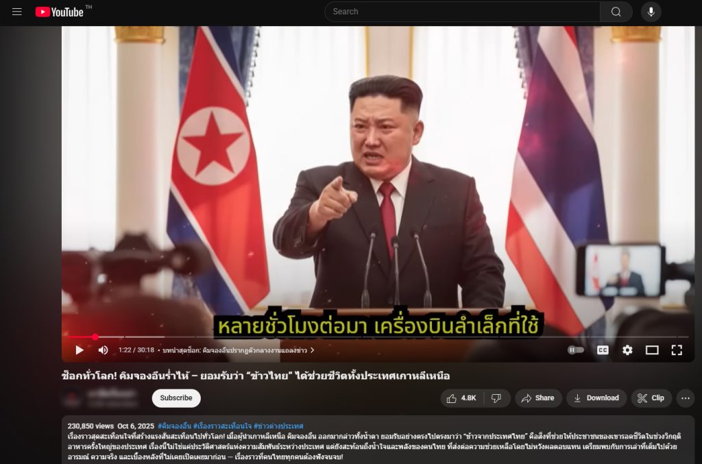 จากการตรวจสอบของ Thai PBS Verify พบว่า คลิปดังกล่าวถูกโพสต์โดยช่องยูทูบที่ช่องหนึ่งซึ่งคลิปดังกล่าวมียอดผู้เข้าชมไปกว่า 230,000 ครั้ง โดยคลิปดังกล่าวระบุข้อความ “ช็อกทั่วโลก! คิมจองอึนร่ำไห้ – ยอมรับว่า “ข้าวไทย” ได้ช่วยชีวิตทั้งประเทศเกาหลีเหนือ” ถูกโพสต์เมื่อวันที่ 7 ต.ค. 68 ที่ผ่านมา เนื้อหาภายในคลิปอ้างว่า “เกาหลีเหนือเพิ่งผ่านช่วงการขาดแคลนอาหาร จนทำให้ปริมาณอาหารของประชาชนเหลือ 10 วัน และหลายประเทศปฏิเสธการช่วยเหลือ จนคณะผู้แทนพิเศษของเกาหลีเหนือ ต้องบินมาขอความช่วยเหลือจากรัฐบาลไทย จนทำให้ทางการไทยมอบข้าวให้จำนวน 20,000 ตัน ซึ่งทำให้ คิมจองอึน ร้องไห้จากความช่วยเหลือในครั้งนี้” โดยคลิปดังกล่าวมีความยาวถึง 30 นาที