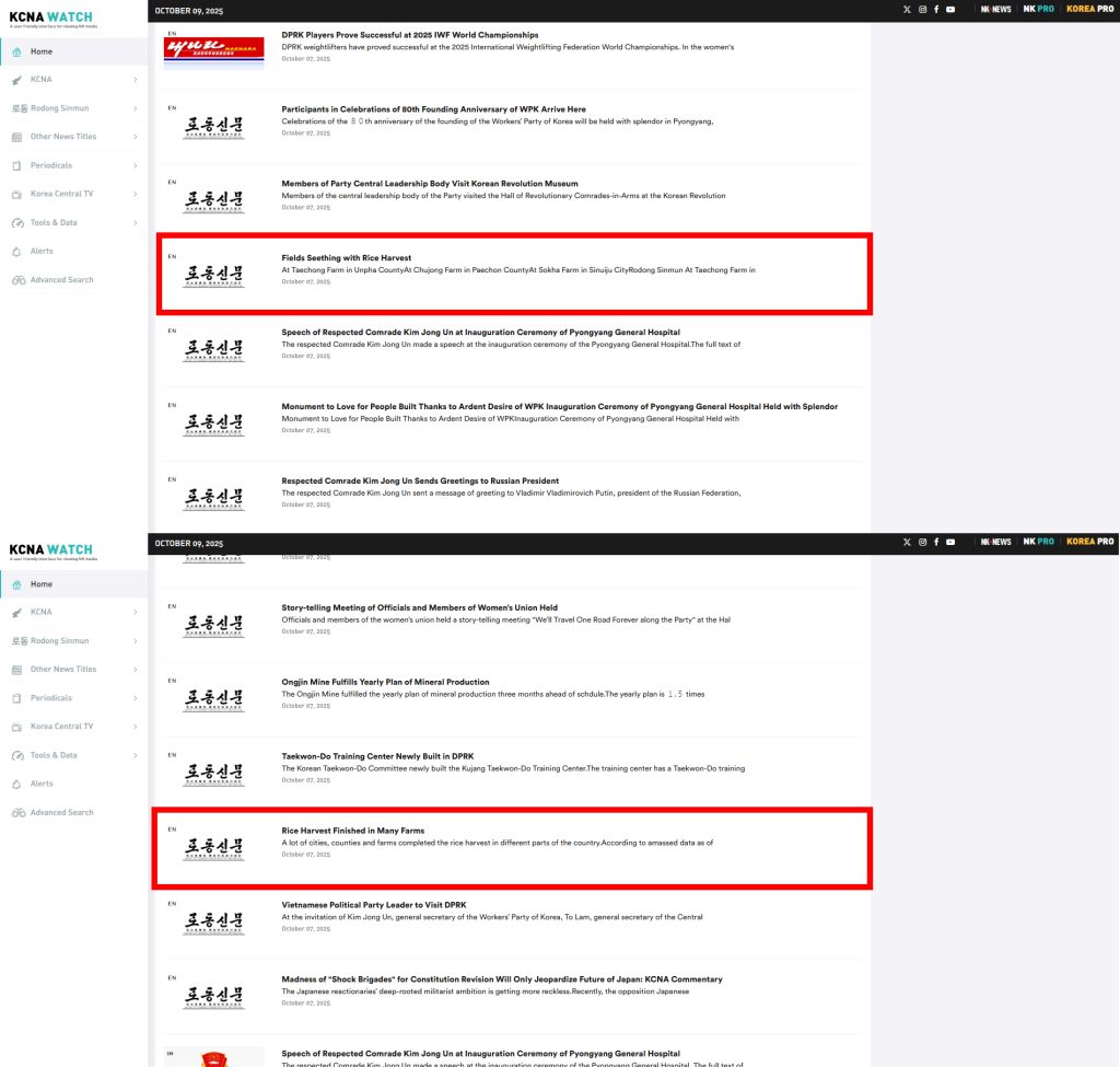 นอกจากนี้เมื่อตรวจสอบไปยังเว็บไซต์ KCNA ซึ่งเป็นสำนักข่าวของเกาหลีเหนือ ที่นำเสนอข่าวเมื่อวันที่ 7 ต.ค. 68 ที่ผ่านมา ไม่พบว่า มีการรายงานข่าวที่เกี่ยวข้องกับการส่งข้าวของไทยให้กับเกาหลีเหนือแต่อย่างใด มีเพียงรายงานข่าวเรื่องการเก็บเกี่ยวข้าวของเกาหลีเหนือในวันเดียวกันจำนวน 2 ข่าว ได้แก่ นาข้าวหลายไร่เก็บเกี่ยวเสร็จเรียบร้อยแล้ว และ ทุ่งนาเต็มไปด้วยข้าวที่เก็บเกี่ยว