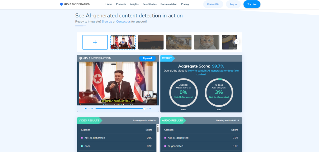 เรานำคลิปดังกล่าวไปด้วยเครื่องมือตรวจสอบ AI จาก Hivemoderation ผลการตรวจสอบปรากฏว่า คลิปดังกล่าวมีความเป็นได้ที่จะถูกสร้างจาก AI ถึง 99.07%