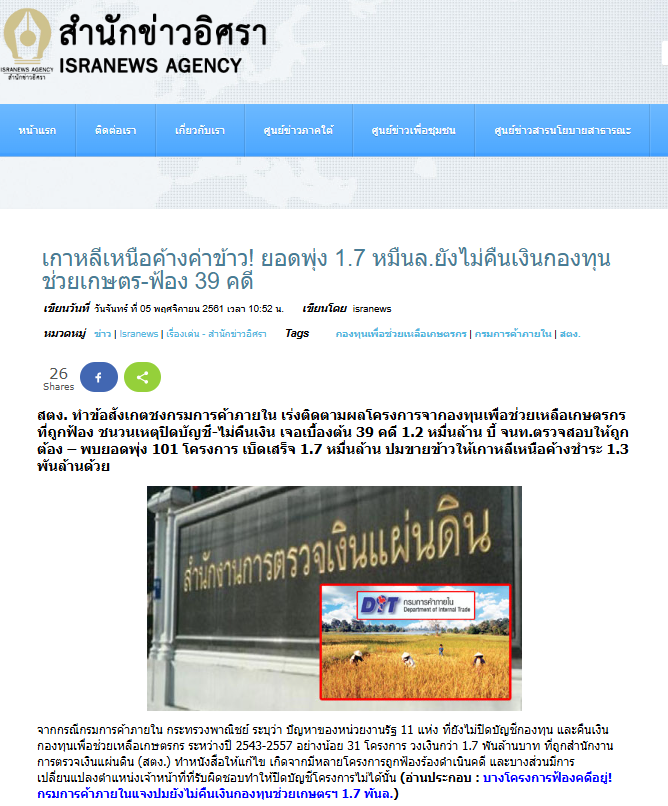 สำนักข่าวอิศรา รายงานข่าวเกาหลีเหนือค้างค่าข้าว! ยอดพุ่ง 1.7 หมื่นล.ยังไม่คืนเงินกองทุนช่วยเกษตร-ฟ้อง 39 คดี