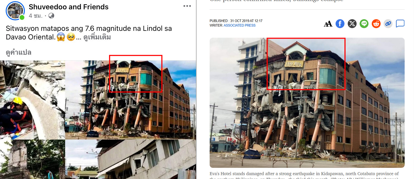 ภาพบันทึกหน้าจอเปรียบเทียบระหว่าง (ซ้าย) โพสต์ที่ตั้งใจบิดเบือนให้ผู้คนเข้าใจผิดว่าเป็นภาพความเสียหายจากสถานการณ์แผ่นดินไหว ณ วันที่ 10 ต.ค. 68 และ (ขวา) ภาพจากรายงานข่าวของ Bangkok Post ซึ่งเผยแพร่รายงานเมื่อวันที่ 31 ต.ค. 62 (2019) ซึ่งเมื่อนำมาเปรียบเทียบพบว่าเป็นภาพโรงแรมเดียวกัน