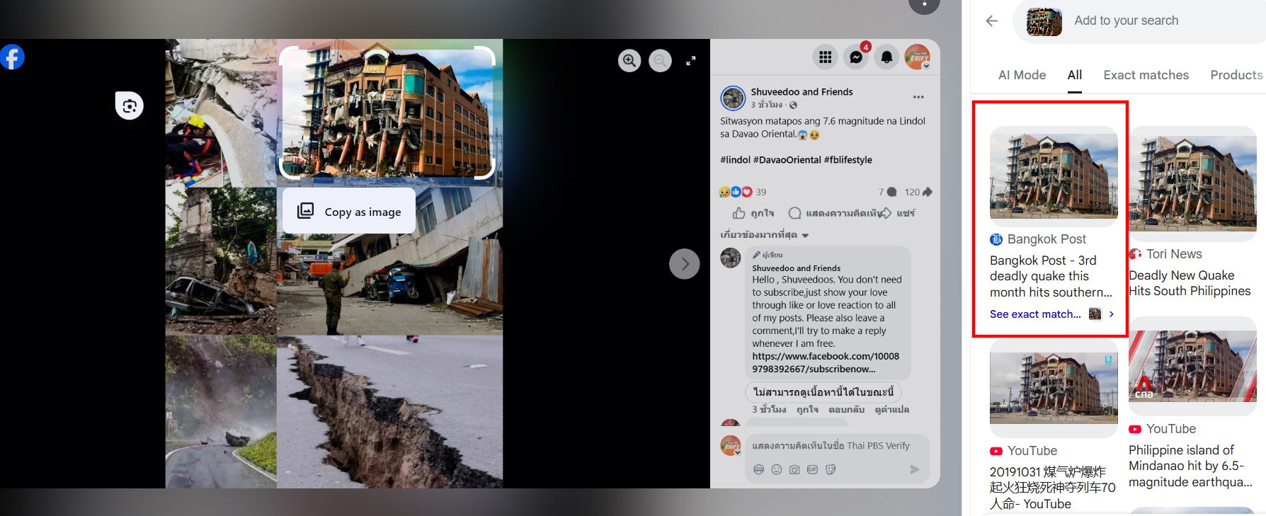 เมื่อนำภาพดังกล่าวไปค้นหาด้วยเครื่องมือตรวจสอบภาพ Google Lens พบว่าตรงกับรายงานข่าวของ Bangkok Post ที่ระบุว่า “3rd deadly quake this month hits southern Philippines” (แผ่นดินไหวรุนแรงครั้งที่ 3 ของเดือนนี้ถล่มพื้นที่ตอนใต้ของฟิลิปปินส์) ซึ่งเผยแพร่รายงานเมื่อวันที่ 31 ต.ค. 62 (2019)