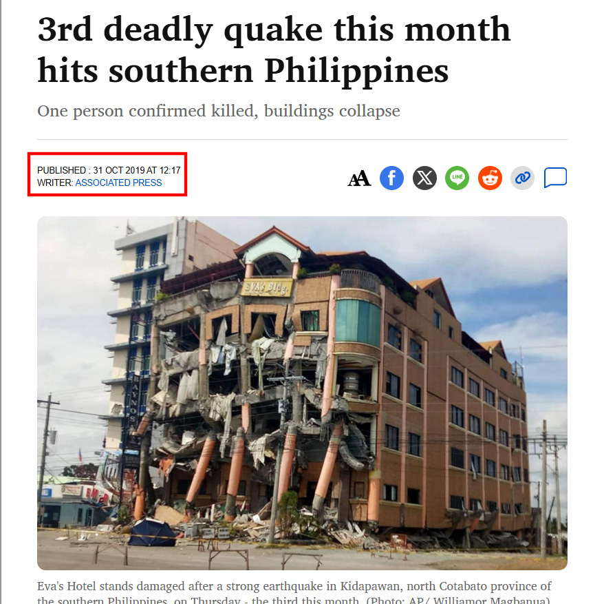 ภาพที่ถูกเผยแพร่ใน Facebook อ้างว่า เป็นภาพโรงแรมที่ได้รับความเสียหายจากเหตุแผ่นดินไหวขนาด 7.6 ที่เมืองดาเวา โอเรียนทัล ประเทศฟิลิปปินส์ เมื่อวันที่ 10 ต.ค. 68 ไม่ใช่ภาพเหตุการณ์ล่าสุด ซึ่งจากการตรวจสอบพบว่าภาพดังกล่าวตรงกับรายงานข่าวของ Bangkok Post, CNN และ AFP Forum เมื่อวันที่ 31 ต.ค. 62 (2019) ซึ่งเป็นเหตุแผ่นดินไหวขนาด 6.5 ที่เมืองคีดาปาวัน (Kidapawan) จังหวัดโคตาบาโต ทางตอนใต้ของฟิลิปปินส์