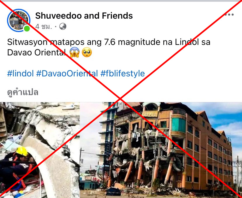 จากสถานการณ์แผ่นดินไหว ขนาด 7.4 นอกชายฝั่งเมืองดาเวา เกาะมินดาเนา ประเทศฟิลิปปินส์ เมื่อวันที่ 10 ต.ค. 68 Thai PBS Verify ตรวจสอบพบผู้ใช้บัญชี Facebook รายหนึ่งโพสต์ภาพอ้างถึงความเสียหายจากเหตุการณ์แผ่นดินไหวที่ดาเวา ขนาดความรุนแรง 7.6 โดยหนึ่งในภาพที่เผยแพร่เป็นภาพอาคารโรงแรมที่ได้รับความเสียหาย ซึ่งเผยแพร่ในวันเดียวกันนั้น จนทำให้เกิดความเข้าใจผิดต่อผู้ที่พบโพสต์ดังกล่าว