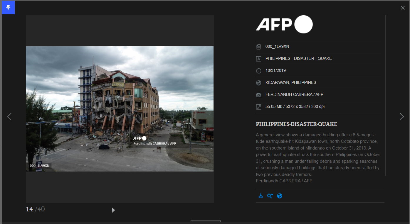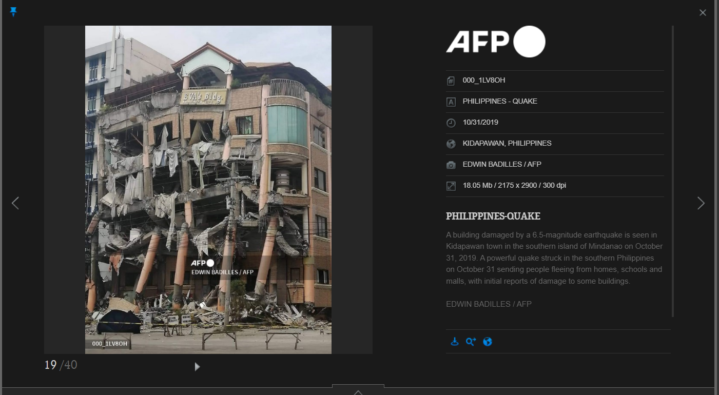เมื่อนำเหตุการณ์ดังกล่าวไปค้นหาในเว็บไซต์แฟ้มภาพเหตุการณ์ AFP Forum พบรายละเอียดของภาพโรงแรม Eva’s Hotel ในสถานการณ์แผ่นดินไหวที่ประเทศฟิลิปปินส์ เมื่อปี 2019