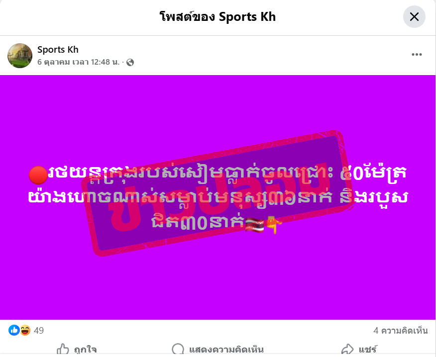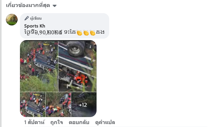 ตรวจสอบพบผู้ใช้บัญชี Facebook รายหนึ่งโพสต์ภาษากัมพูชาอ้างว่าเกิดอุบัติเหตุรถบัสของไทยตกเหวลึก 50 เมตร และมีผู้เสียชีวิต 36 คน พร้อมแชร์ภาพอุบัติเหตุดังกล่าวในช่องแสดงความคิดเห็น นอกจากนี้เรายังพบโพสต์ลักษณะนี้ในช่องทาง Thread