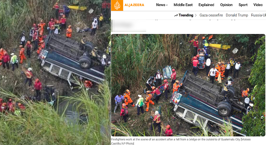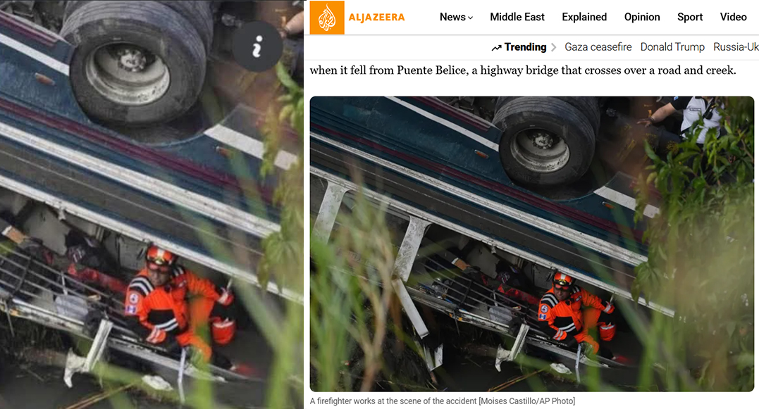 ภาพบันทึกหน้าจอเปรียบเทียบระหว่าง (ภาพซ้าย) จากโพสต์ที่อ้างว่าเป็นภาพรถโดยสารตกเหวที่เกิดขึ้นในประเทศไทย กับ ภาพจากรายงานของสำนักข่าว Al Jazeera ที่ระบุว่าเป็นอุบัติเหตุรถโดยสารสาธารณะตกสะพาน ที่ประเทศกัวเตมาลา โดยอ้างอิงแฟ้มภาพจาก AP เผยแพร่ข่าวเมื่อวันที่ 10 ก.พ. 68 (ภาพขวา) เมื่อนำภาพมาเปรียบเทียบกันพบว่า สภาพแวดล้อมและบริบทสถานการณ์คล้ายกัน ซึ่งบ่งชี้ว่าเป็นเหตุการณ์เดียวกัน