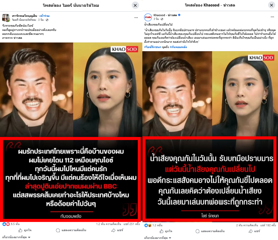 ภาพบันทึกหน้าจอแสดงโพสต์ปลอม (ซ้าย) เปรียบเทียบกับ ภาพจากโพสต์ของข่าวสด (ขวา)