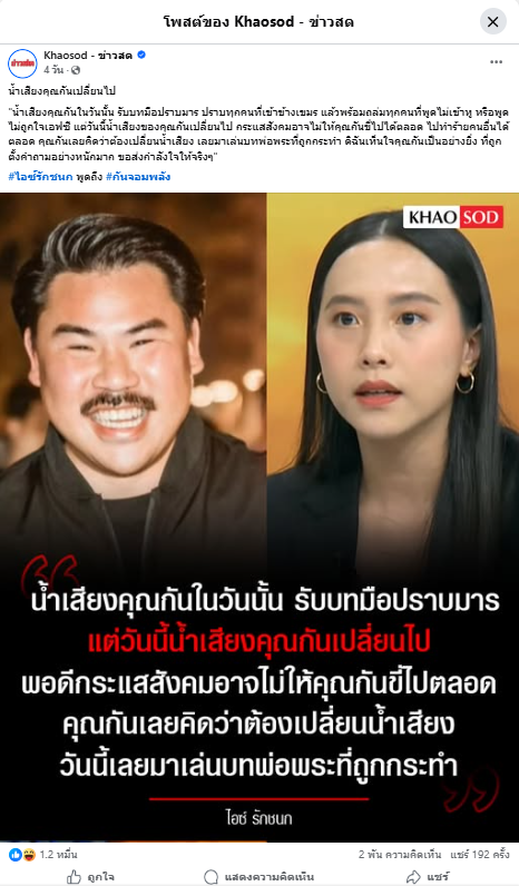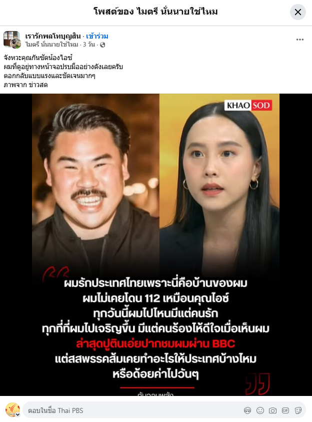 ผู้ใช้บัญชีเฟซบุ๊กชื่อ “ไมตรี นั่นนายใช่ไหม” โพสต์ภาพของ “กัน จอมพลัง” และ “ไอซ์ รักชนก” พร้อมข้อความระบุว่า “ผมรักประเทศไทยเพราะนี่คือบ้านของผม ผมไม่เคยโดน 112 เหมือนคุณไอซ์ ทุกวันนี้ผมไปไหนมีแต่คนรัก ทุกที่ที่ผมไปเจริญขึ้น มีแต่คนร้องไห้ดีใจเมื่อเห็นผม ล่าสุดปูตินเอ่ยปากชมผมผ่าน BBC แต่สส.พรรคส้มเคยทำอะไรให้ประเทศบ้างไหม หรือด้อยค่าไปวัน ๆ กัน จอมพลัง” พร้อมระบุว่า ภาพดังกล่าวเป็นช่วงการตอบโต้กันของ “กัน จอมพลัง” และ “ไอซ์ รักชนก” โดยระบุที่มาของภาพดังกล่าวว่ามาจาก ข่าวสด