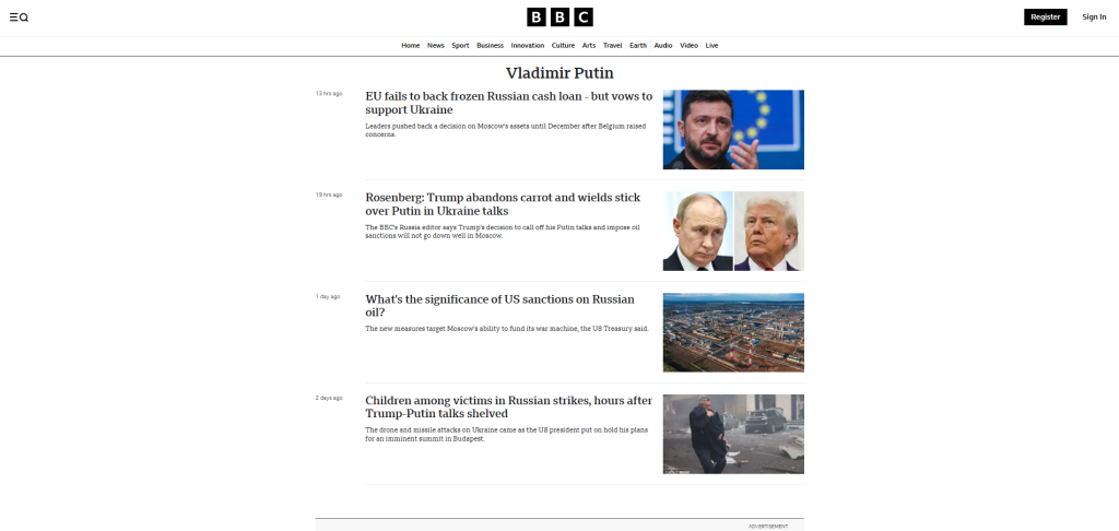 ภาพบันทึกหน้าจอแสดงผลการค้นหาแท็กข่าวที่เกี่ยวข้องกับ วลาดิเมียร์ ปูติน ซึ่งไม่พบข่าวที่เกี่ยวข้องกับ กัน จอมพลัง ในข่าวของ BBC แต่อย่างใด