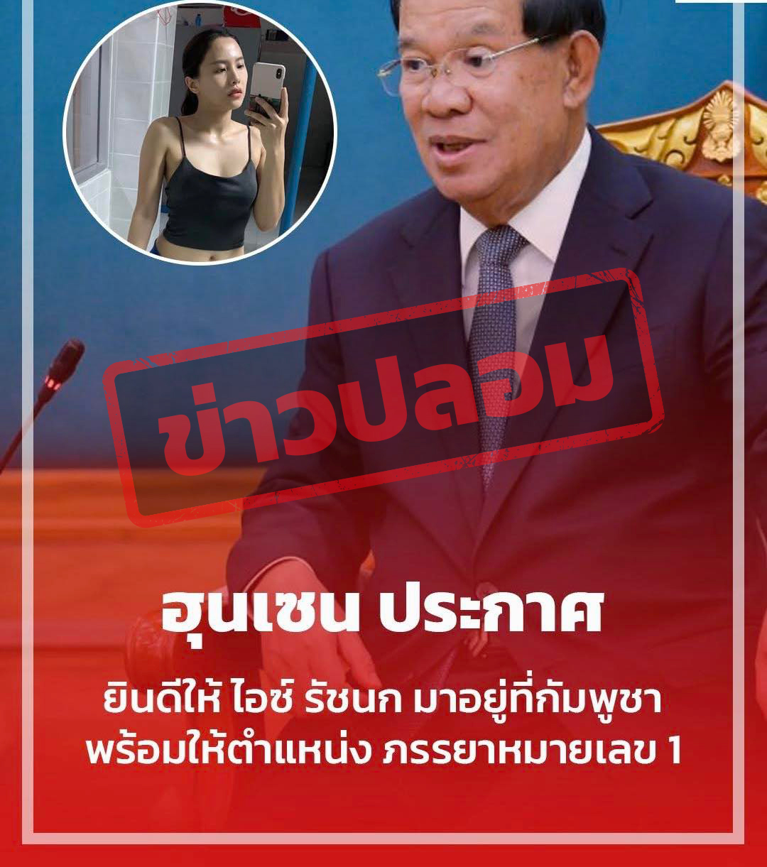 เนื้อหาที่อ้างว่า “ฮุน เซน อดีตนายกรัฐมนตรีกัมพูชา ประกาศเชิญ ไอซ์ รักชนก ศรีนอก ส.ส. กรุงเทพมหานคร พรรคประชาชน ไปอยู่ที่กัมพูชา และแต่งตั้งให้เป็นภรรยาหมายเลข 1” เป็น ข่าวปลอม