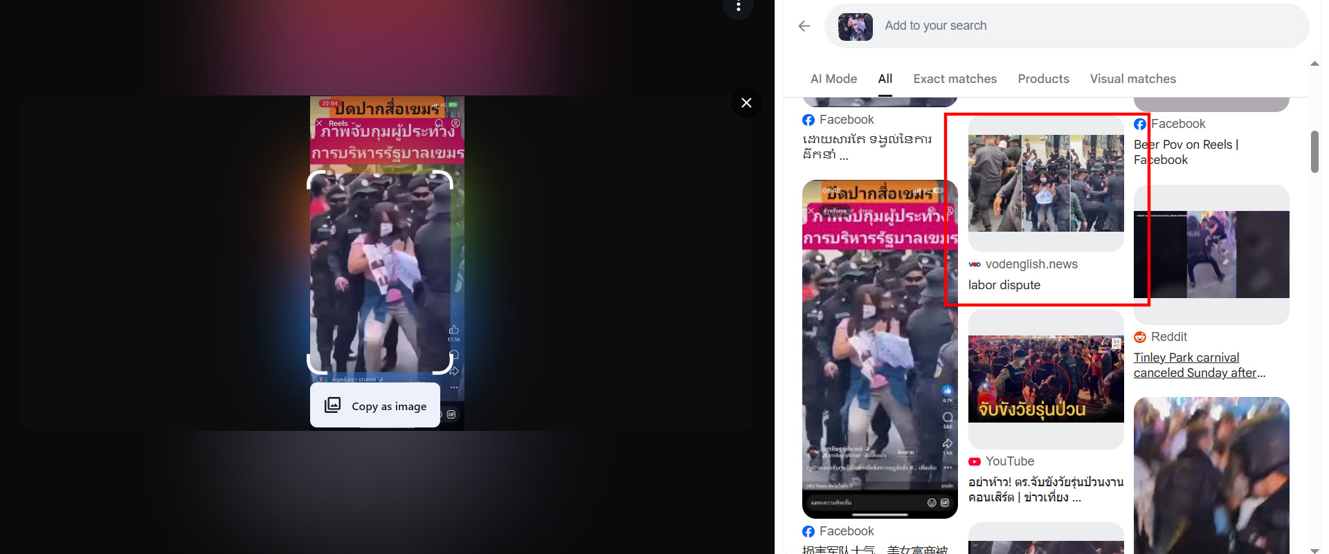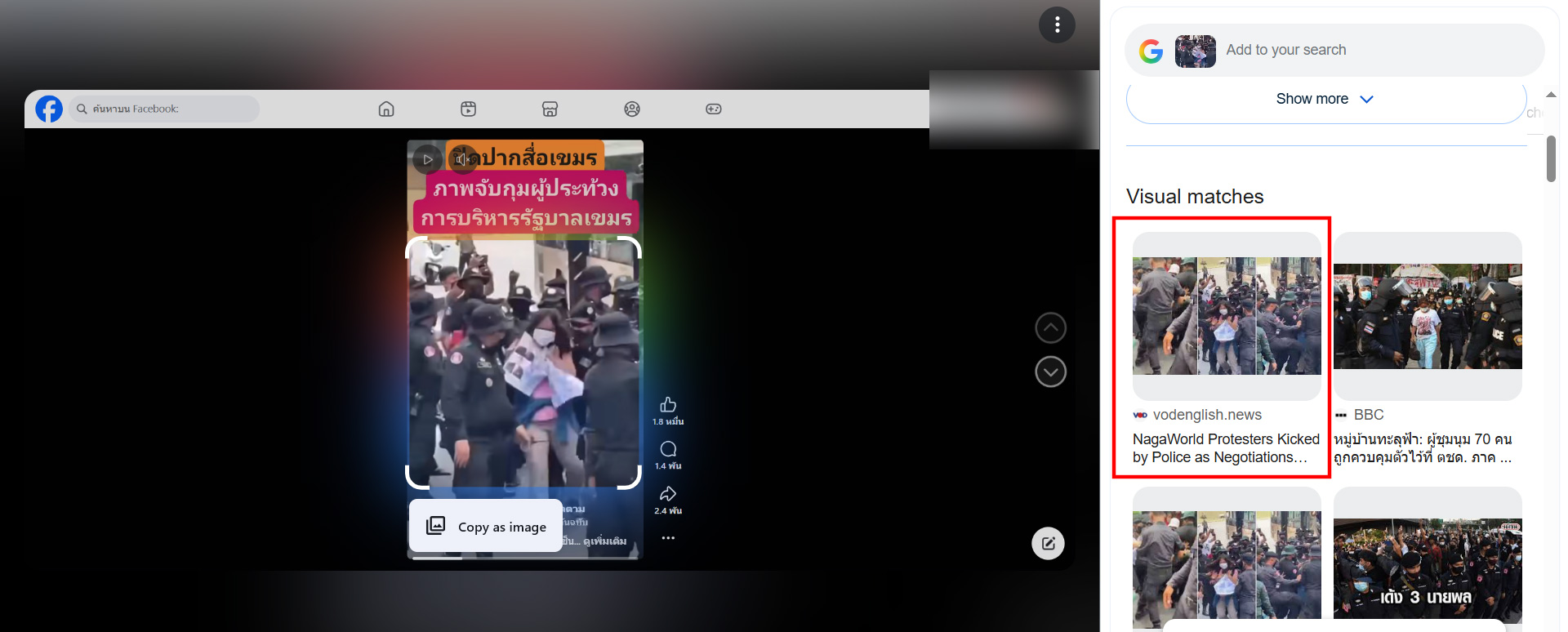 เมื่อแยกภาพบางส่วนจากคลิปวิดีโอนั้นออกมาเป็น Keyframes ด้วยเครื่องมือ InVID Weverify และนำไปตรวจสอบต่อผ่าน Google Lens พบว่าภาพดังกล่าวตรงกับรายงานของสื่อกัมพูชาเมื่อปี 2022 ซึ่งระบุว่าเป็นเหตุการณ์ที่เจ้าหน้าที่ตำรวจใช้ความรุนแรงกับผู้ชุมนุมซึ่งเป็นอดีตพนักงานที่ถูกเลิกจ้างจากคาสิโน NagaWorld ในประเทศกัมพูชา