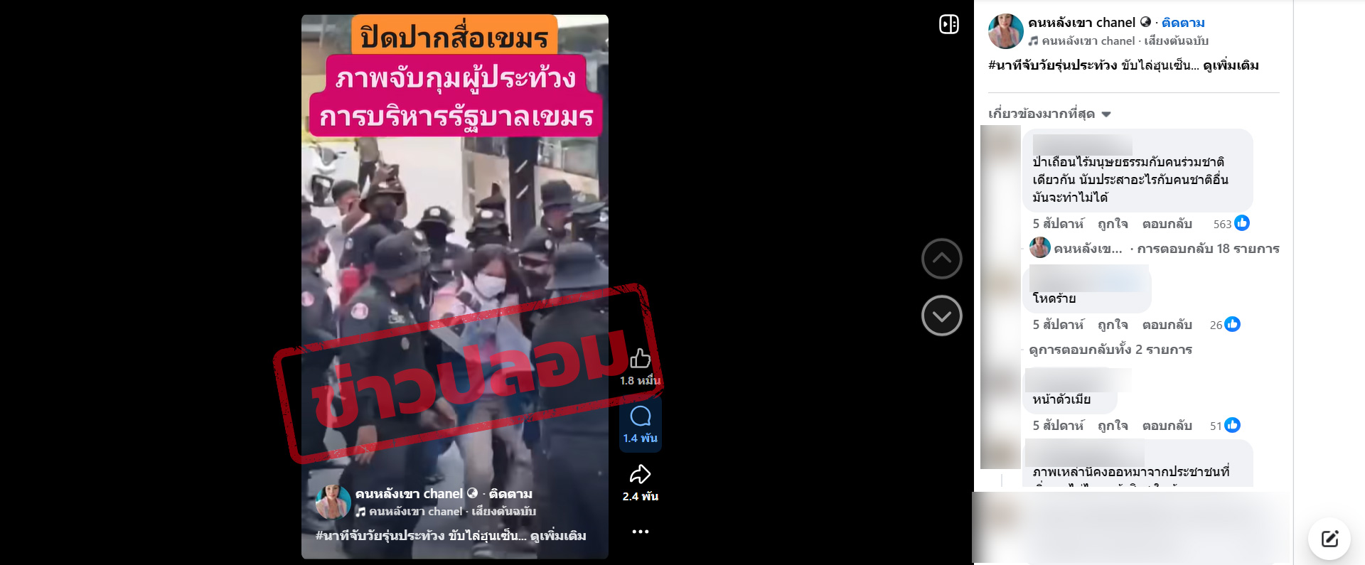 ตรวจสอบพบบัญชีผู้ใช้รายหนึ่งโพสต์คลิปอ้างเกิดเหตุการณ์จับกุมผู้ประท้วงการบริหารรัฐบาลกัมพูชา “ขับไล่ฮุนเซ็น” โดยปรากฏยอดถูกใจ 18,000 ครั้ง รวมถึงมีผู้เข้ามาแสดงความคิดเห็น 1,400 ข้อความ และแชร์ 2,400 ครั้ง