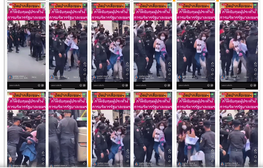 ภาพที่ผู้ใช้บัญชีรายหนึ่งอ้างคลิปว่าเป็นภาพจับกุมผู้ประท้วง การบริหารงานรัฐบาลของกัมพูชา