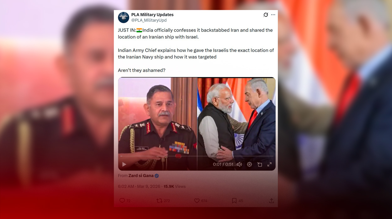 “JUST IN: India officially confesses it backstabbed Iran and shared the location of an Iranian ship with Israel. Indian Army Chief explains how he gave the Israelis the exact location of the Iranian Navy ship and how it was targeted Aren’t they ashamed?”