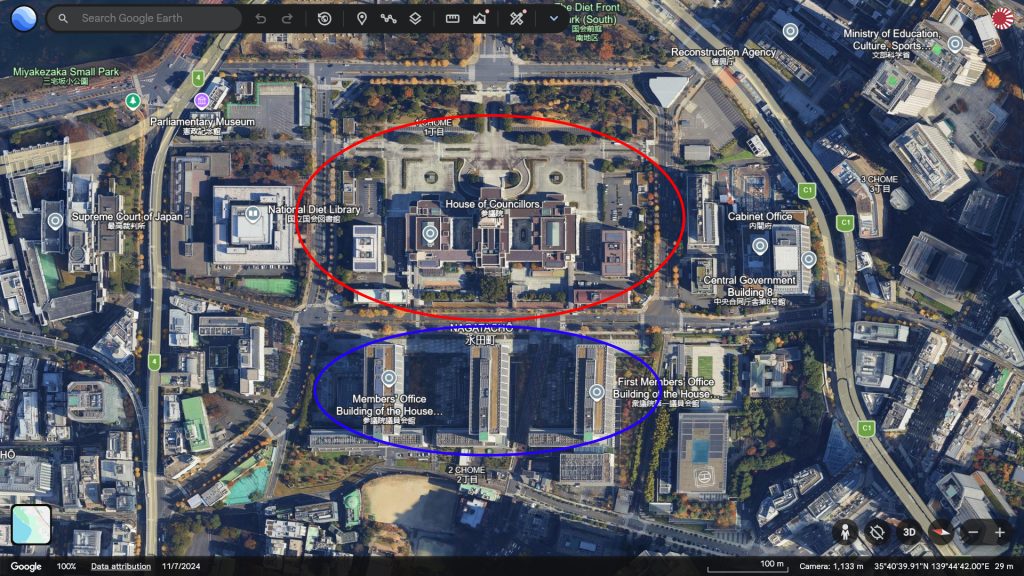 A satellite view of the National Diet of Japan from Google Earth shows the layout of the area, with the National Diet Building circled in red and the Diet Members’ Office Building circled in blue.