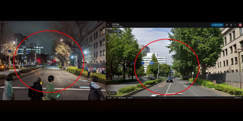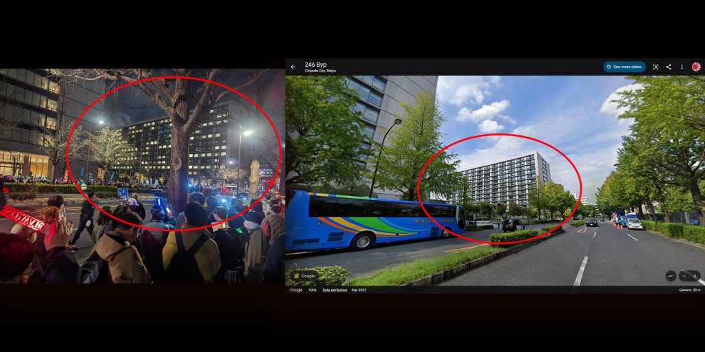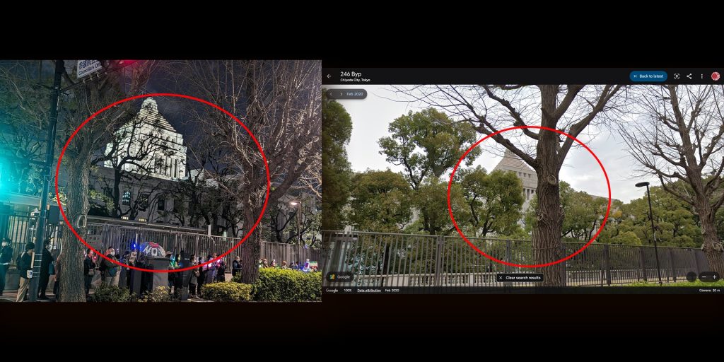 Comparative imagery showing the demonstration on the street behind the National Diet Building (left) versus the corresponding Street View perspective (right) for location verification.