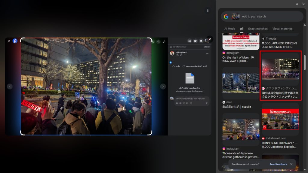 Thai PBS Verify analyzed the visuals from the aforementioned video via Google Lens. The results revealed that the images matched a Facebook post by a Japanese user named Koji Sugihara on March 19, 2026. The post features four photos of the protest accompanied by the following caption: