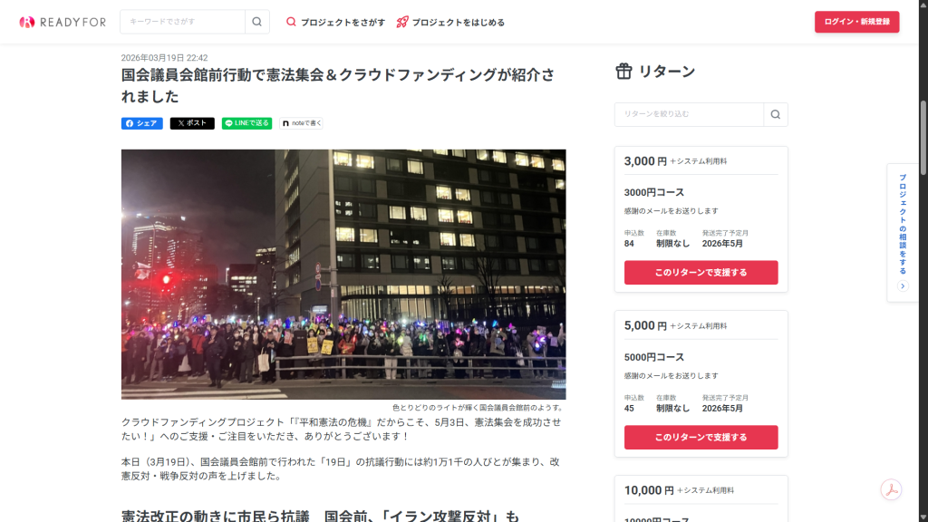 クラウドファンディングプロジェクト「『平和憲法の危機』だからこそ、5月3日、憲法集会を成功させたい!」へのご支援・ご注目をいただき、ありがとうございます!