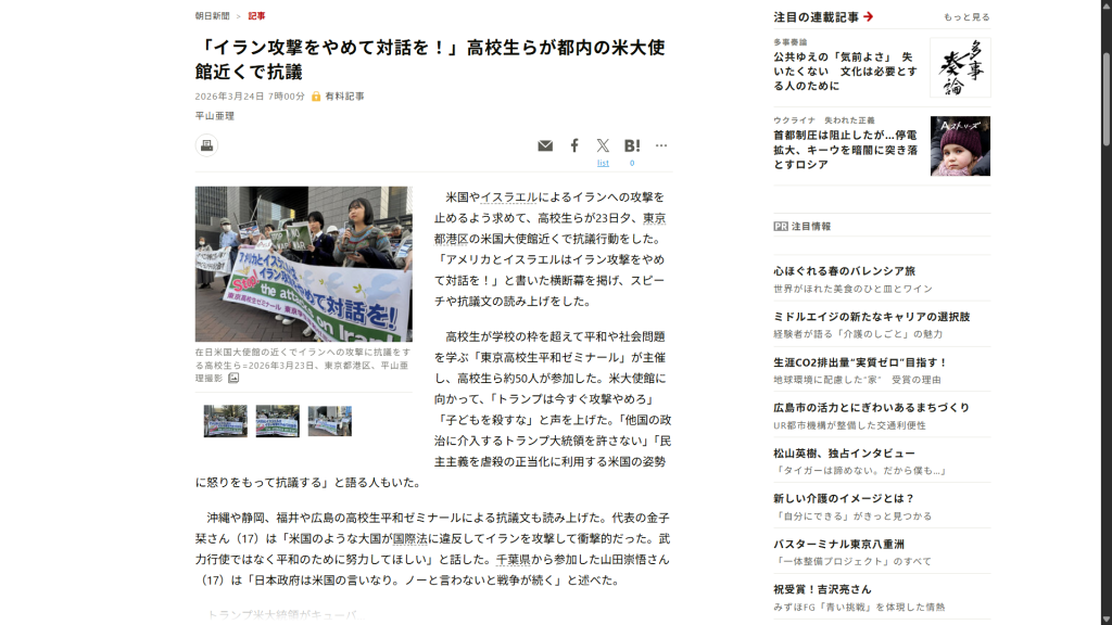 “On March 23, 2026, approximately 50 high school students from the group ‘Tokyo Kokosei Heiwa Seminar’ gathered near the U.S. Embassy in Tokyo to protest against potential military strikes on Iran by the United States and Israel. The youth activists held up signs calling for a shift from military force to diplomatic dialogue, while also voicing their criticism of the situation as they criticized President Trump for interfering in international politics and using democracy as a pretext to justify the use of force. Such actions, they argued, constitute a grave violation of international law.