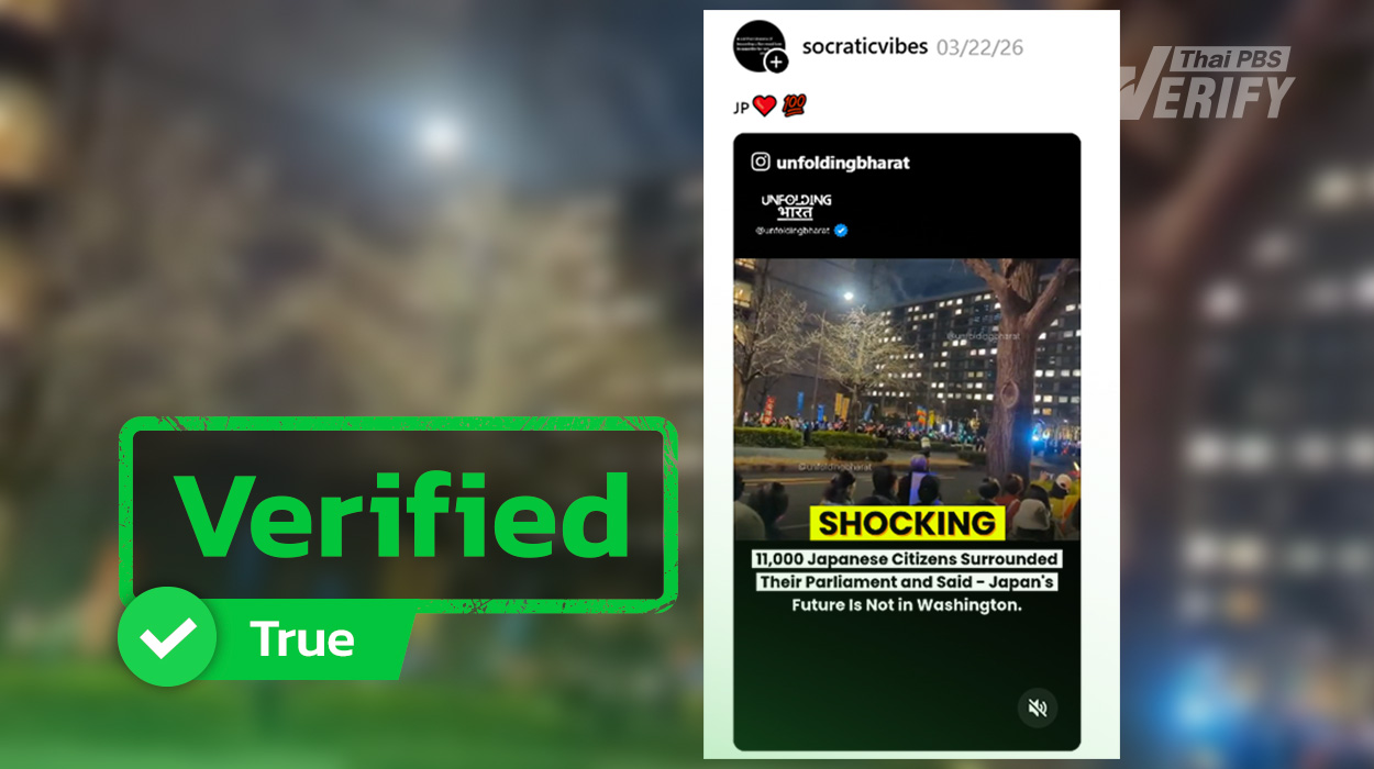 Thai PBS Verify found that the video and information regarding the protest were real. The event took place on the night of March 19, 2026, in front of the National Diet Building and the Diet Members’ Office Buildings in the Nagatacho district of Tokyo.