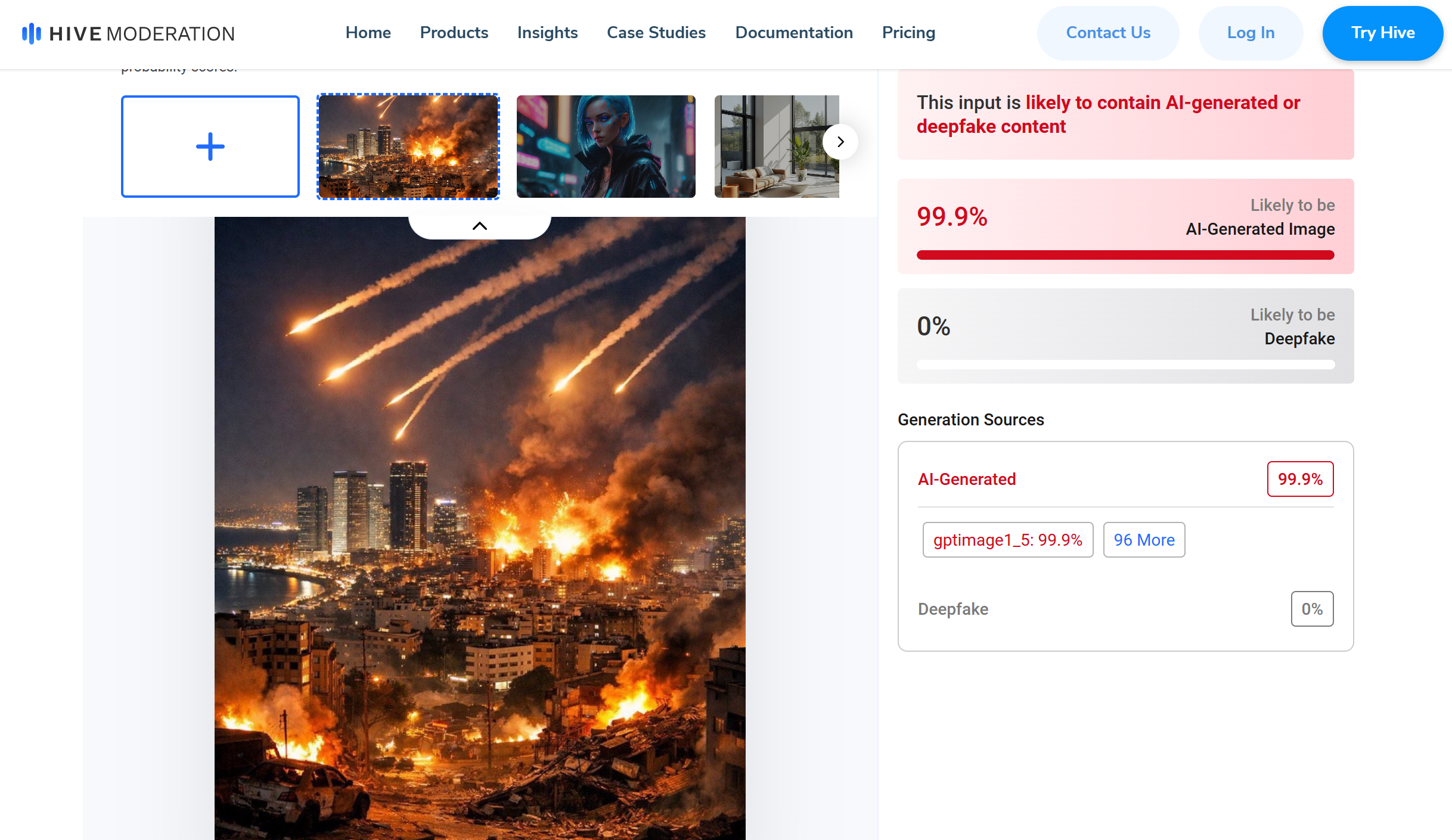 Further analysis, using AI-detection tools from Hive Moderation, found a 99.9% likelihood that the image was AI-generated.
