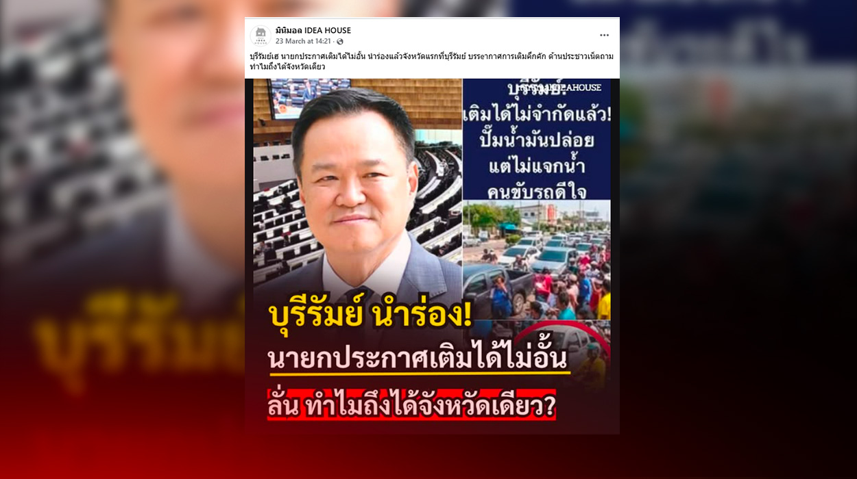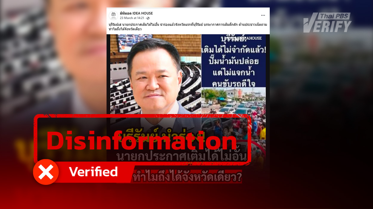 Thai PBS Verify has determined that the post claiming ‘Buriram celebrates as PM announces unlimited refueling policy’ is false. It incorrectly suggests that the province is offering unrestricted fuel supplies. In reality, the Buriram Provincial Energy Office has clarified that these rumors are untrue, confirming that refueling limits remain in effect to ensure fair and widespread distribution.
