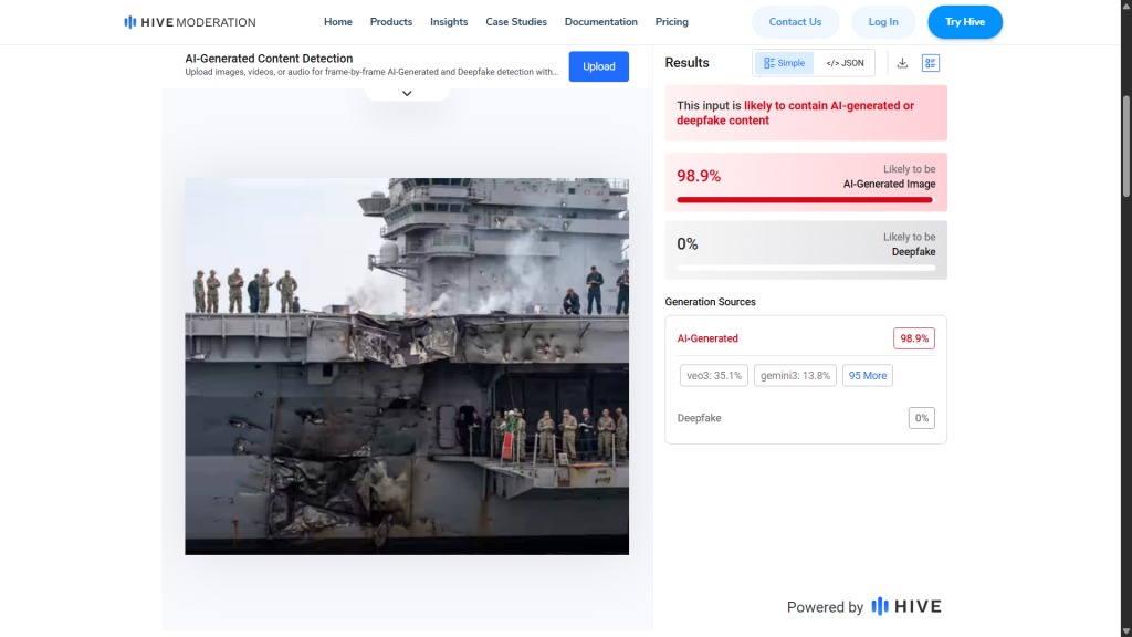 Meanwhile, other details in another image — such as the depiction of navy personnel inspecting damage on the aircraft carrier’s deck — were also analyzed. Hive Moderation’s results showed that this image was 98.9% likely to have been AI-generated.