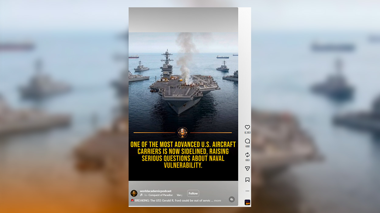Thai PBS Verify found an Instagram reel published by user ‘worldacademicpodcast’ on March 29, 2026. The video shows the damaged U.S. aircraft carrier USS Gerald R. Ford, accompanied by the following descriptions: