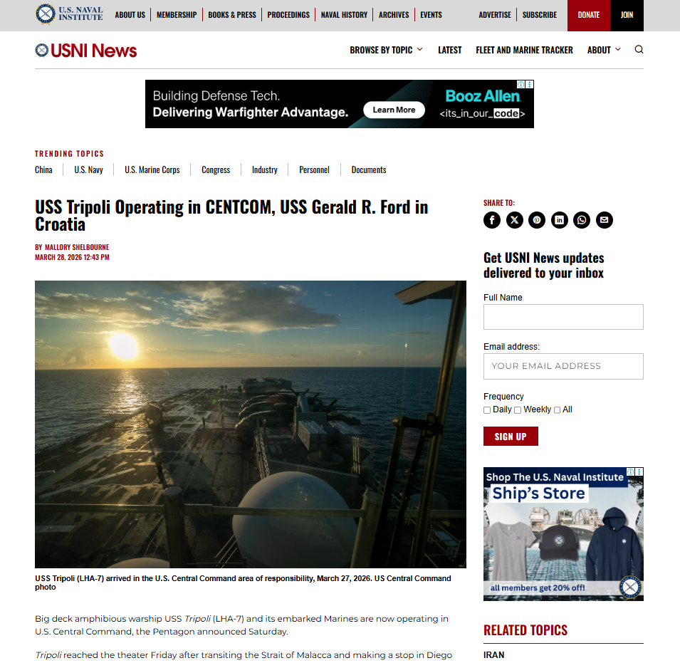 In addition, according to the USNI News Fleet & Marine Tracker report dated March 23, 2026, the amphibious assault ship USS Tripoli (LHA-7) arrived in the operational area on March 27, 2026, as reported by CENTCOM. It was accompanied by the USS New Orleans (LPD-18) and the 31st Marine Expeditionary Unit, under orders from the U.S. Department of Defense.