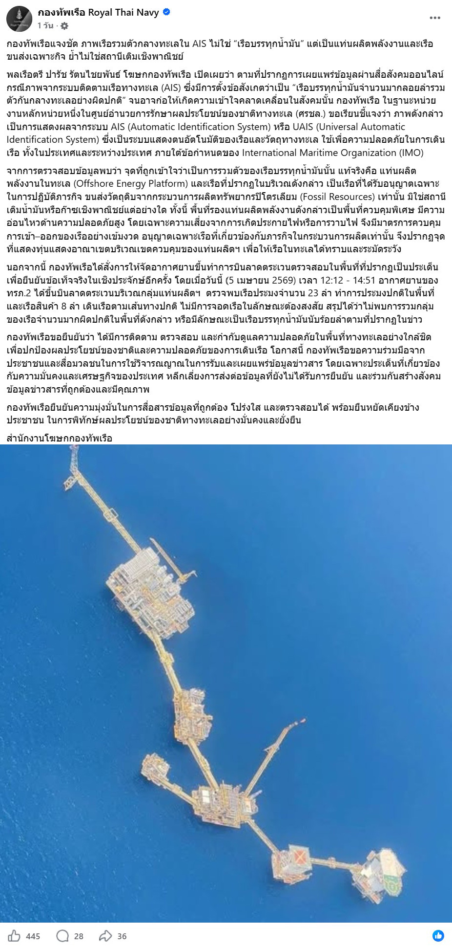 Rear Admiral Parach Rattanachaiyapan, Navy spokesperson, stated that the images actually displayed the positions of offshore energy production platforms. The vessels shown were specially authorized ships tasked with transporting raw materials from petroleum resource production processes — not commercial fuel stations or tankers hoarding oil.