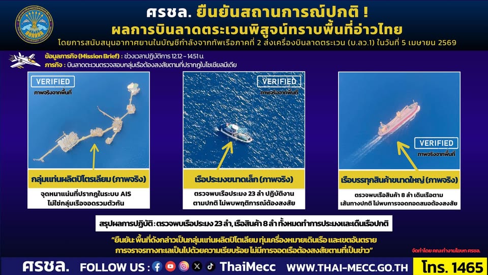 At the same time, the Royal Thai Navy ordered aerial patrols to verify the facts. On April 5, 2026, from 12:12 to 14:51 o’clock, the Second Naval Area Command conducted surveillance flights and observed 23 fishing vessels and 8 cargo ships operating normally. No abnormal clustering was detected, nor were large numbers of oil tankers found as claimed.