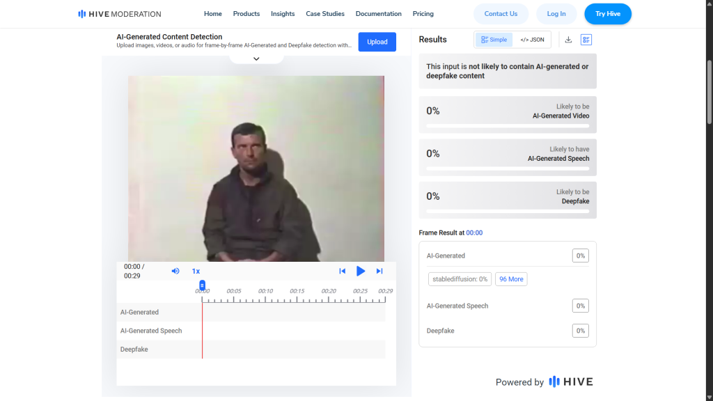 Thai PBS Verify examined the video with Hive Moderation and found that the likelihood of it being AI-generated was 0%, indicating that it was not an AI-created video at all.