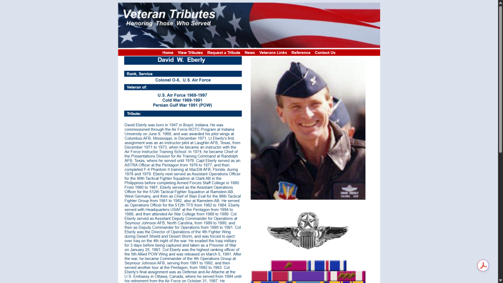 “Col Eberly was the Director of Operations of the 4th Fighter Wing during Desert Shield and Desert Storm, and was forced to eject over Iraq on the 4th night of the war. He evaded the Iraqi military for 3 days before being captured and taken as a Prisoner of War on January 25, 1991. Col Eberly was the highest ranking officer of the 5th Allied POW Wing and was released on March 5, 1991.