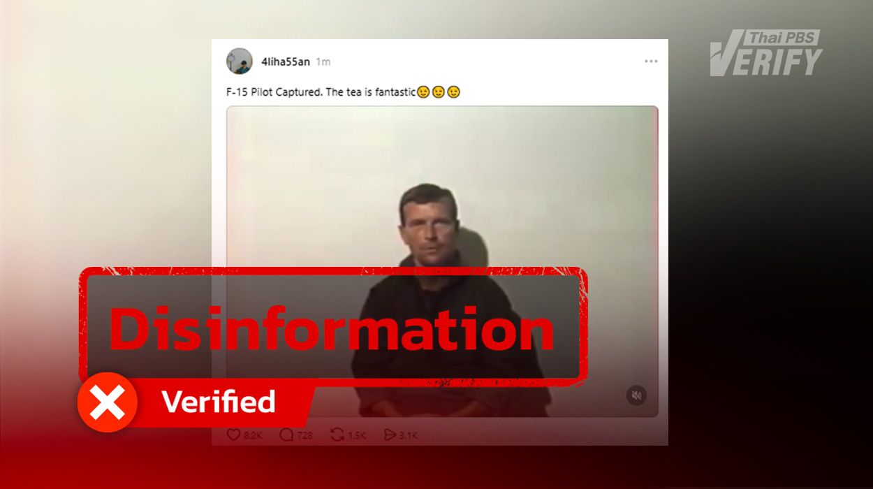Thai PBS Verify found a video on Threads posted by user ‘4liha55an’ on April 4, 2026. The clip shows a detained man confessing that he is a U.S. soldier. The caption reads: “F-15 Pilot Captured. The tea is fantastic😉😉😉”