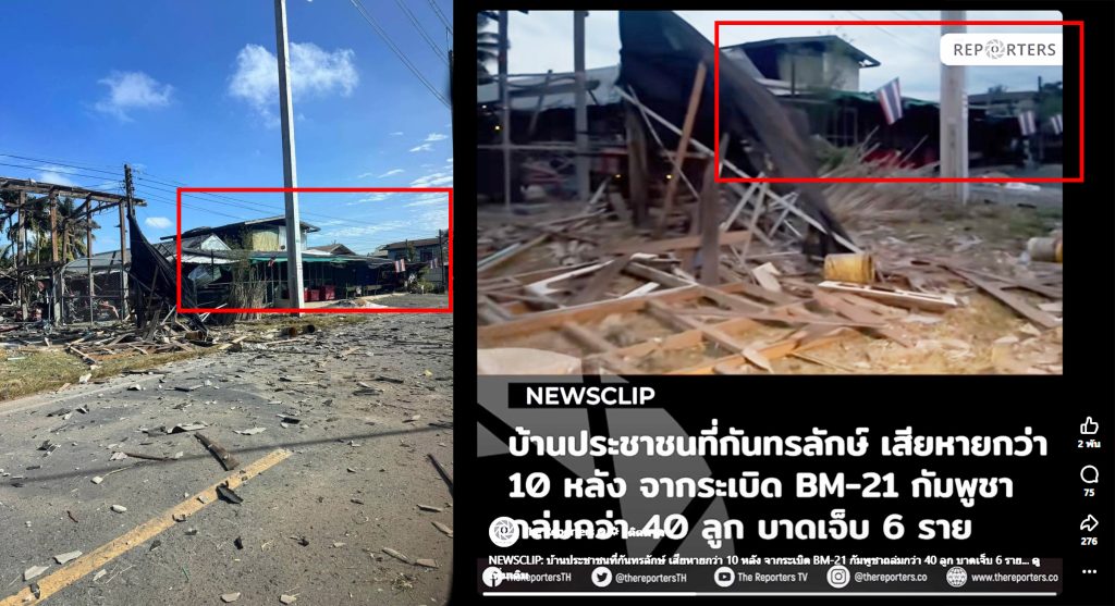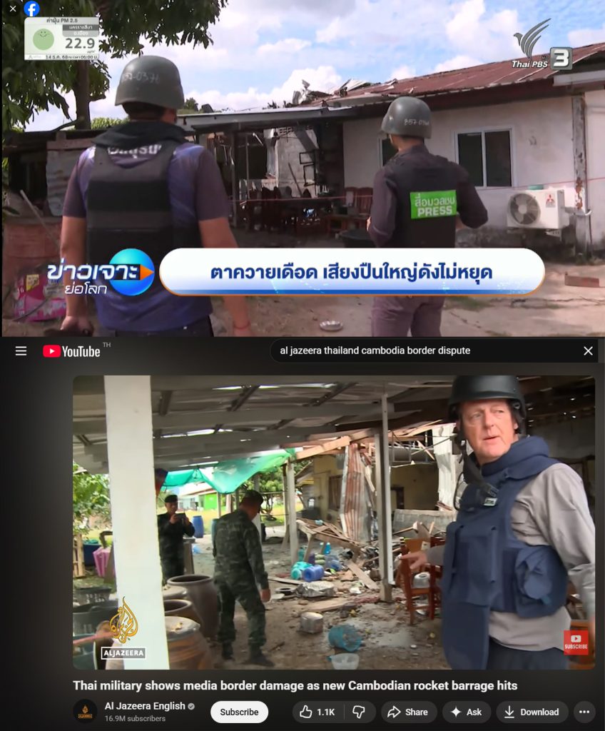 Images of the damage to people’s residences from BM-21 rockets in the ‘Khaojo Yor Lok’ news program, compared with Al Jazeera’s on-site news reporting, which captured the BM-21 rocket firing while they were reporting in Surin province.