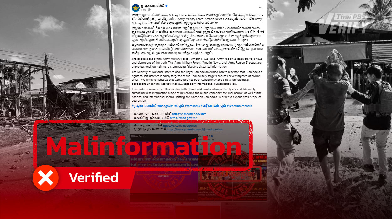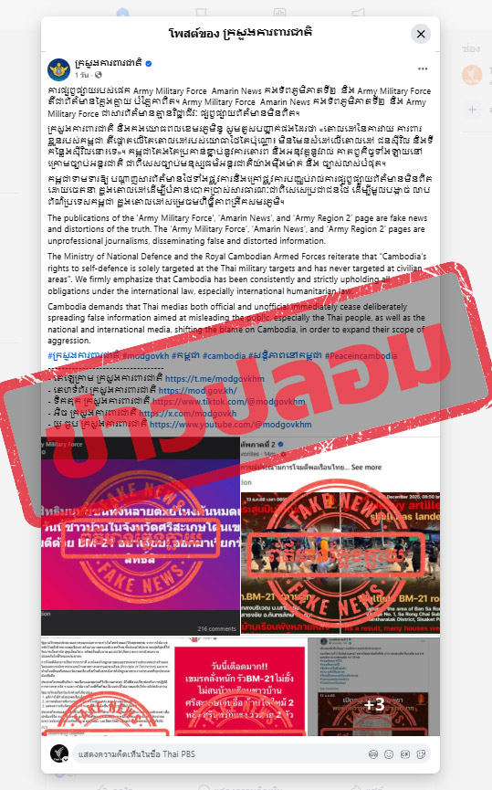 The Facebook page “ក្រសួងការពារជាតិ”, which belongs to the Cambodian Ministry of Defense, denied that Cambodia did not fire BM-21 rockets into a Thai community area. Simultaneously, the page accused Thai media and social media pages of publishing fake news and distorting the truth. However, such claim is inconsistent with facts apparent from multiple sources.