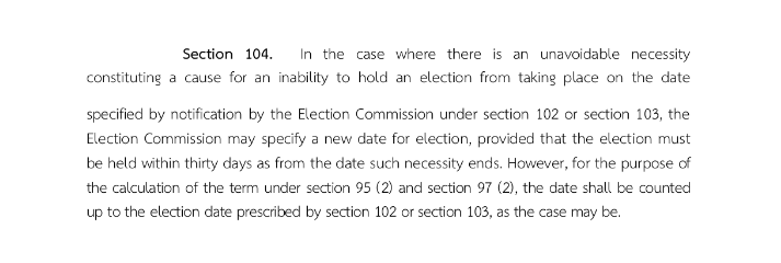 “Section 104 In the case of an unavoidable necessity that prevents the holding of an election on the date announced by the Election Commission under Section 102 or Section 103, the Election Commission may set a new election date. However, the election must be held within thirty days from the date the incident ends. For the purpose of calculating the term of office under Section 95 (2) and Section 97 (2), the calculation shall be based on the election date originally set under Section 102 or Section 103, as the case may be.