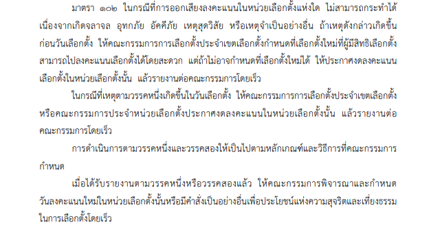 that: “In the case of a by‐election in Sisaket Province, we apply Section 102. When there are problems in certain polling stations or specific areas, that is considered the setting of a new voting day. The terminology used is different.”