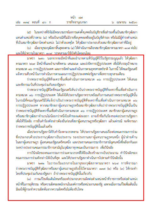 The bill to be enacted for the implementation of Chapter XVI National Reform shall be submitted to and considered by the joint sitting of the National Assembly. When the Council of Ministers deems any bill as a bill to be enacted for the implementation of Chapter XVI National Reform, it shall notify the President of the National Assembly and submit such bill thereto.