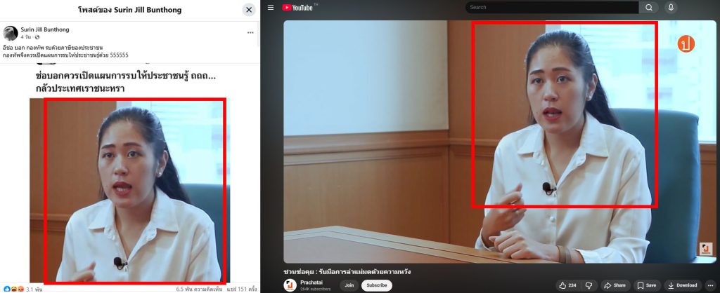 An image from the fake post (left) compared with the Prachatai YouTube channel featuring an interview with Ms. Pannika titled “Conversations with Chor: Facing Witch Hunts with Hope,” published on July 24, 2019.