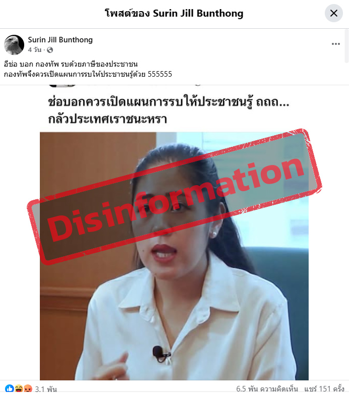 The message stating that “Chor told the military to reveal battle plans to the public because they fight using taxes” is 100% false. Meanwhile, the image used to accompany the post was taken from a Prachatai interview clip published on July 24, 2019, which addressed criticisms of gender discrimination in the House of Representatives and the issue of fake news. It has no connection to recent border incidents.