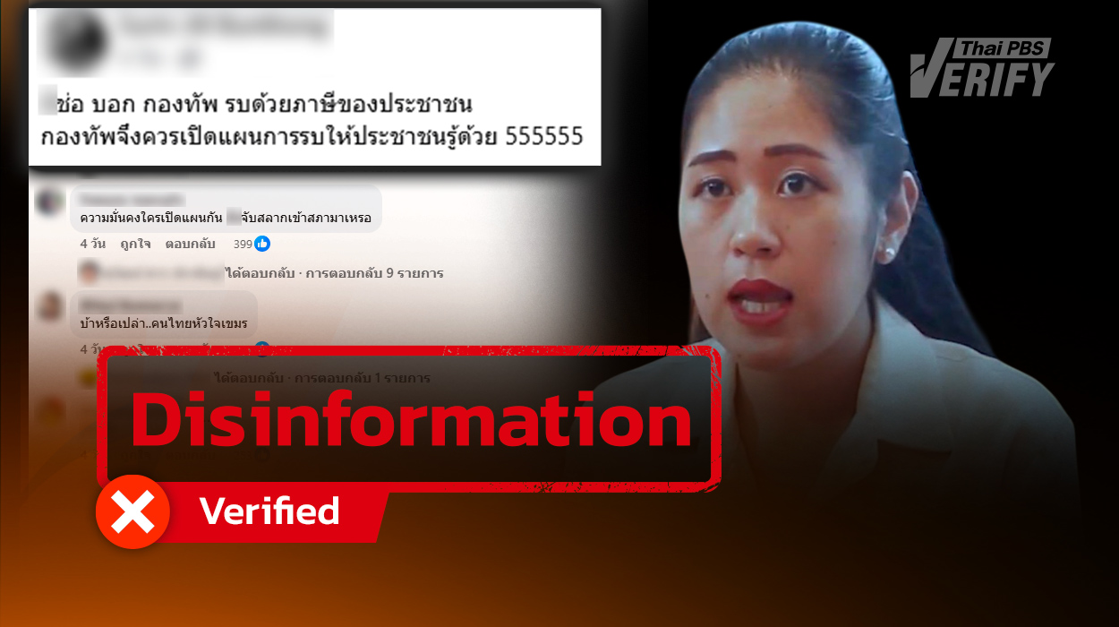 Thai PBS Verify contacted Ms. Pannika, who confirmed she never made the statement in question. She clarified that the post was a clear attempt to stir controversy by suggesting she had demanded the military reveal battle maps. In reality, the audio was taken from a Channel 7 talk program, “Thok Mai Tiang“, which aired on November 14, 2025 and in which she was questioning the administration of PM Anutin Charnvirakul. (Click for archived original content)