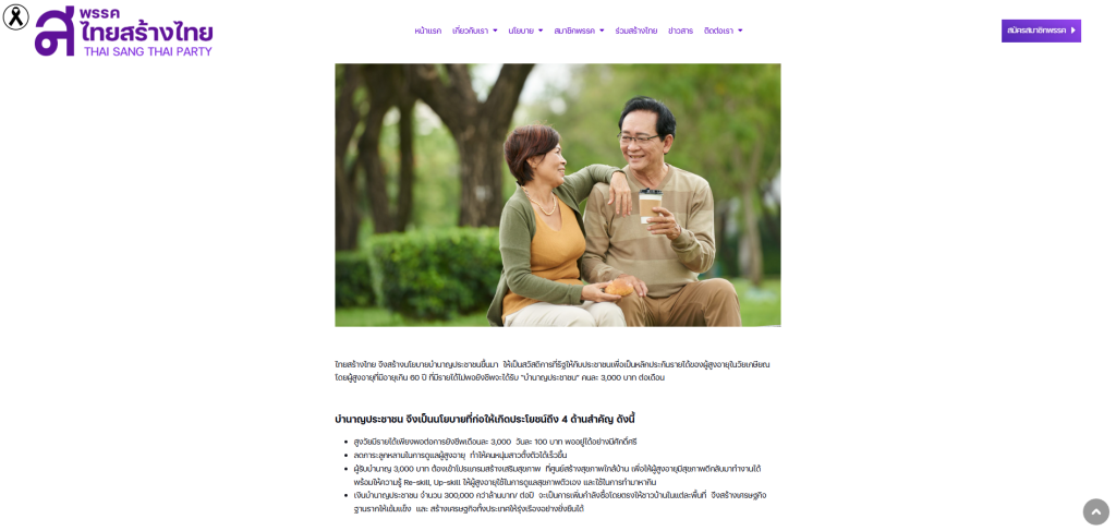 Therefore, Thai Sang Thai has created the People’s Pension policy as a form of welfare provided by the state to serve as income security for elderly people in retirement. Elderly people aged over 60 who do not have sufficient income for subsistence would receive a “People’s Pension” of 3,000 baht per person per month.