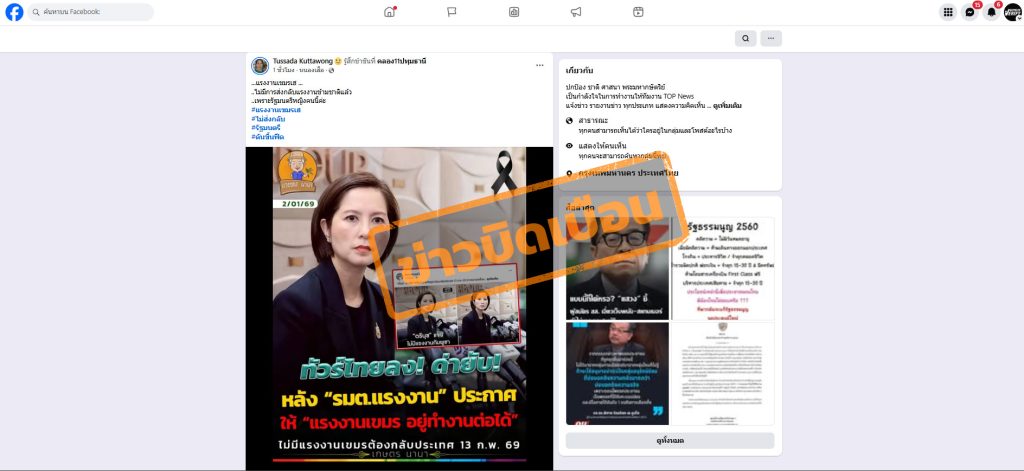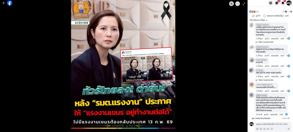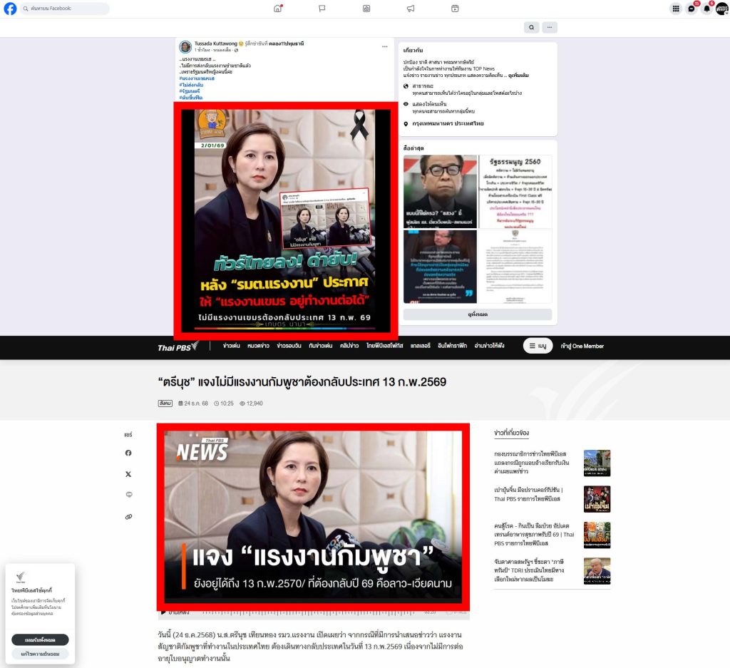 Thai PBS Verify examined the publication using the Google Lens reverse image search tool, and found that the image matches a press conference by Ms. Treenuch, which took place on December 24, 2025, regarding migrant workers in Thailand who would be required to return to their home countries on February 13, 2026.
