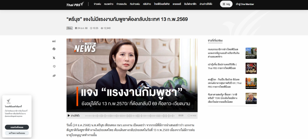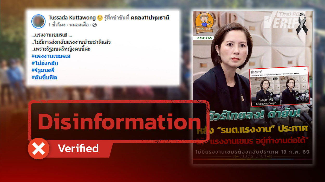 According to reports by Thai PBS, Ms. Treenuch addressed a rumor originating from news outlets: the latter had claimed that Cambodian workers working in Thailand must return to their country on February 13, 2026 due to the non-renewal of their work permits.
